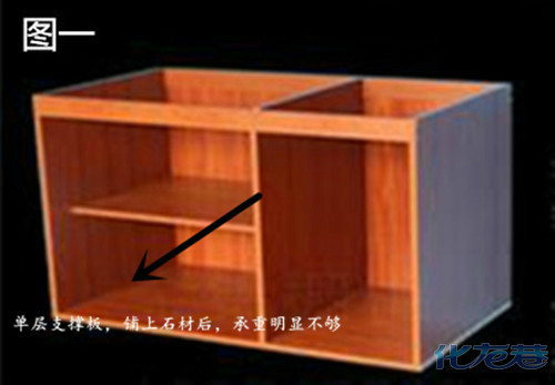 三、臺面下面鋪的臺墊板也是很重要的,有的商家臺墊板通鋪整板,臺面下面全部鋪板,那樣能增加臺面與柜體的接觸面,使臺面受力更均勻!也有商家是用龍骨部分支撐,無疑那樣龍骨與臺面的接觸面積肯定是很少的,反應到臺面上的直接表現就是有龍骨支撐的地方和沒有龍骨支撐的地方會有斷層開裂。也有部分更過分的商家臺面下面是不鋪臺墊板的,那就放棄選擇吧,明顯坑爹!