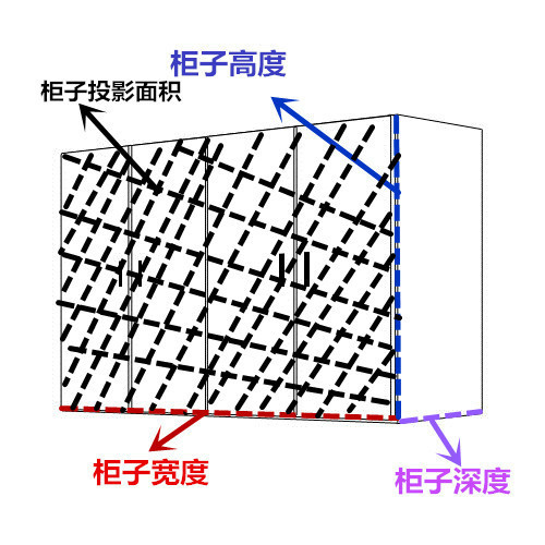 第二種:按投影面積算,所謂的投影面積就是指柜子的正面面積,也就是柜子寬度*柜子高度=柜子投影面積,深度為商家根據柜子的實際作用來標配。按投影算的柜子一般都是柜體和柜門分開算,柜體按投影算,柜門按實用柜門平方來算。常用于衣柜、酒柜、鞋柜等大面積大容量柜子。具體算法如下: