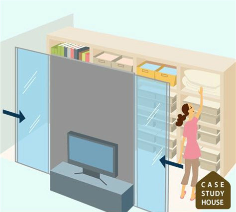 客廳說亂七八糟都可以很快的收納到里面,非常便利。突然來客人的時候也能很快的收拾屋子。
