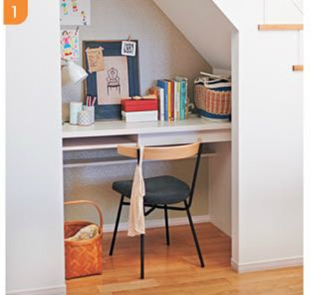 一般的想法,樓梯下基本是作為倉庫來使用。但是在這個戶型中,恰好樓梯側面對著客廳,在這個小空間里布置桌子能夠讓人在融入客廳活動的同時又保持自己空間的私密感,能夠讓媽媽做一些簡單的手工作業或是作為孩子的作業臺。