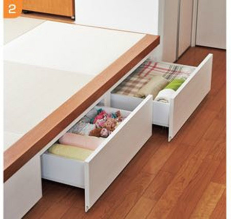 這點已經非常普及了。如果家里有日式榻榻米的話不妨嘗試,收納能力非常強。需要注意的是如果設置抽屜的話,對于榻榻米的結構需要加強,否則荷載導致變形的話抽屜會有打不開的風險。