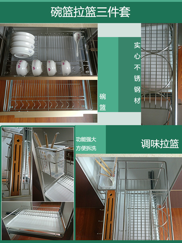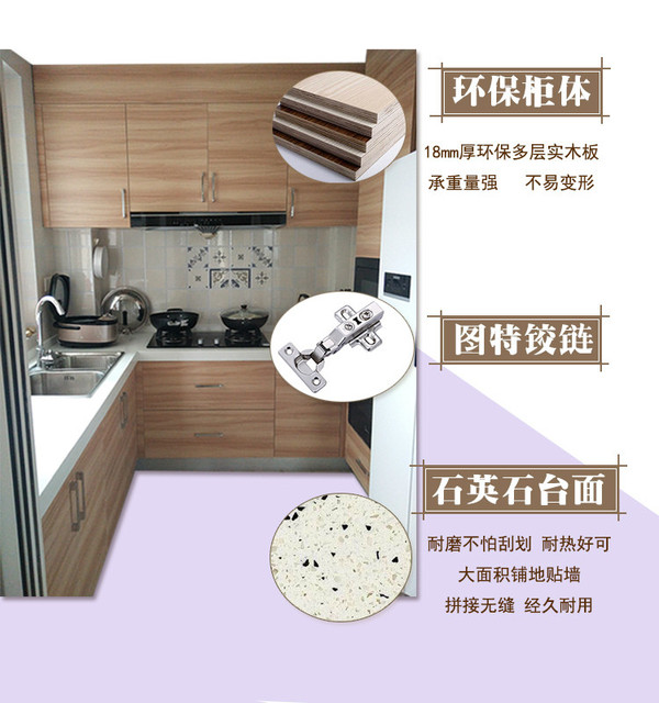 柜體平安樹實(shí)木多層板(桉木芯E0級(jí)),臺(tái)面石英石(單色),品牌圓管不銹鋼拉籃,碗籃,調(diào)味籃,品牌不銹鋼阻尼鉸鏈,拉手(樣式可自選)三組海蒂詩(shī)導(dǎo)軌抽屜。